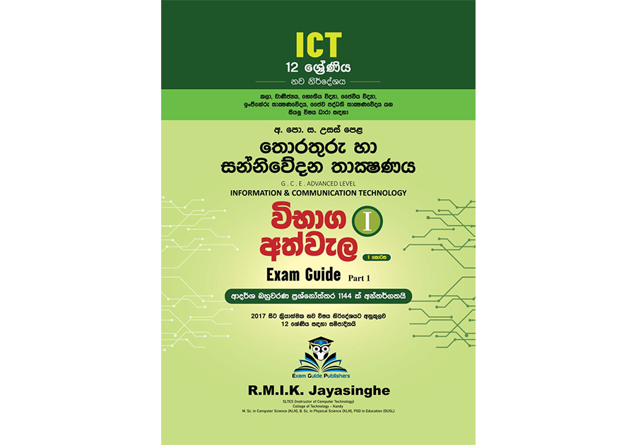 අ.පො.ස උසස් පෙළ 12 ශ්රේණිය තොරතුරු හා සන්නිවේදන තාක්ෂණය – විභාග අත්වැල 1 කොටස, ICT Grade 12 MCQ Answers. R.M.I.K. ජයසිංහ (SLTES (Instructor of Computer Technology), College of Technology -Kandy, M.sc in Computer Science (KLN), B.Sc in Physical Science (KLN), PGD in Education (OUSL)) විසින් කලා, වාණිජ්යය, භෞතීය විද්යා, ජෛවීය විද්යා, ඉංජිනේරු තාක්ෂණවේදය, ජෛව පද්ධති තාක්ෂණවේදය යන සියලු විෂය ධාරා සඳහා අ.පො.ස. උසස් පෙළ තොරතුරු තාක්ෂණ විෂය හදාරණ දුවා දරුවන් වෙනුවෙන් විභාග අත්වැල 1 කොටසට අදාළ ග්රන්ථය රචනා කර ඇත. 2025 නවතම සංශෝදිත මුද්රණය වේ. 2017 වසරේ සිට ක්රියාත්මක නව විෂය නිර්දේශයට අනුකූලව 12 ශ්රේණියට සම්පාදනය කර ඇති මෙම ග්රන්ථය තුළ